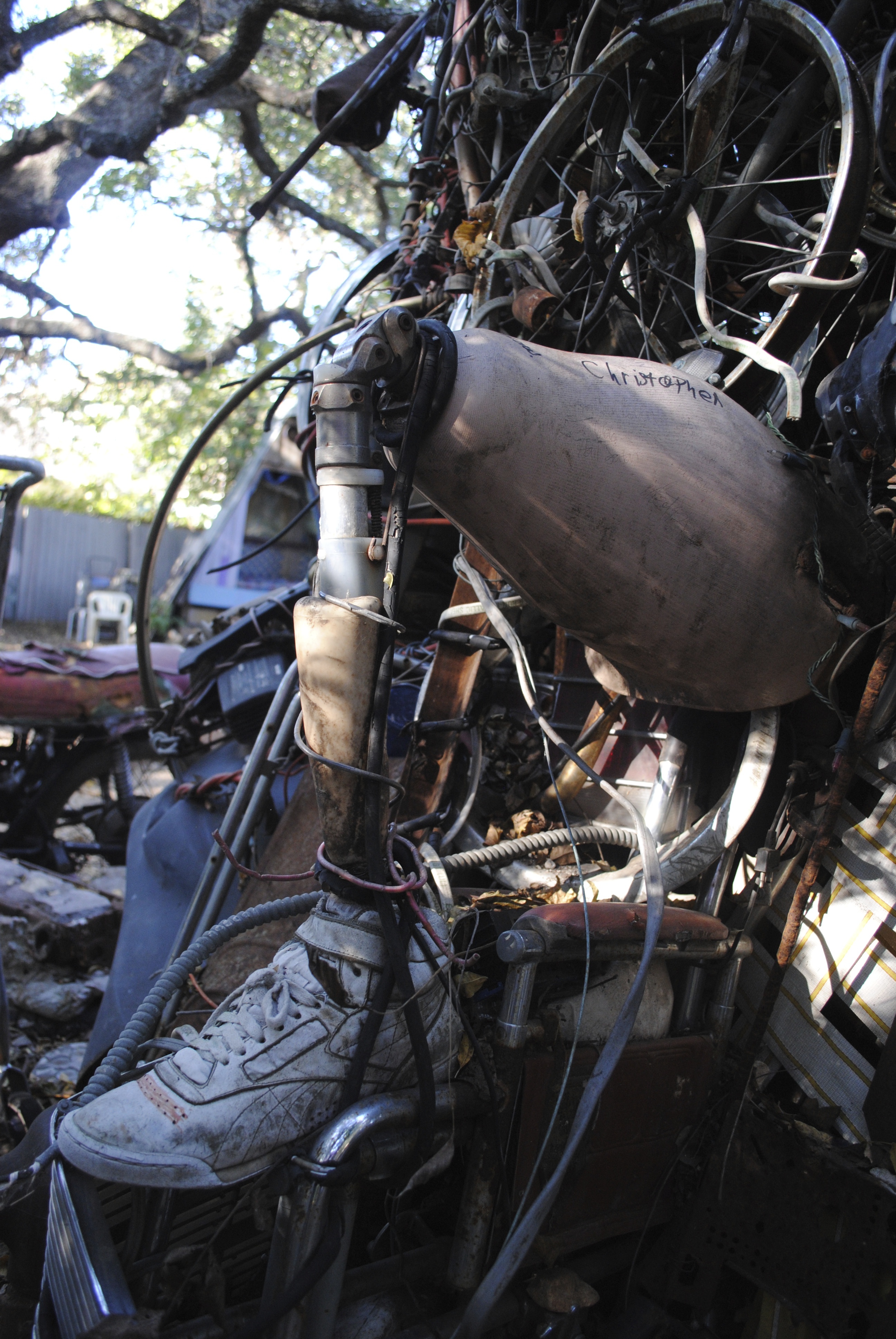 A prosthetic leg juts out from a mass of rusting medical equipment. Hannemann says a physical therapist, on a tour of the Cathedral, noted the leg was made for a tall man. The prosthetic leg is very old, with a rusted metal tibia and a 1980s white hightop sneaker.