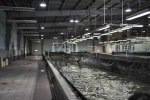 - Trout swim in a spillway, waiting to be weighed and measured.